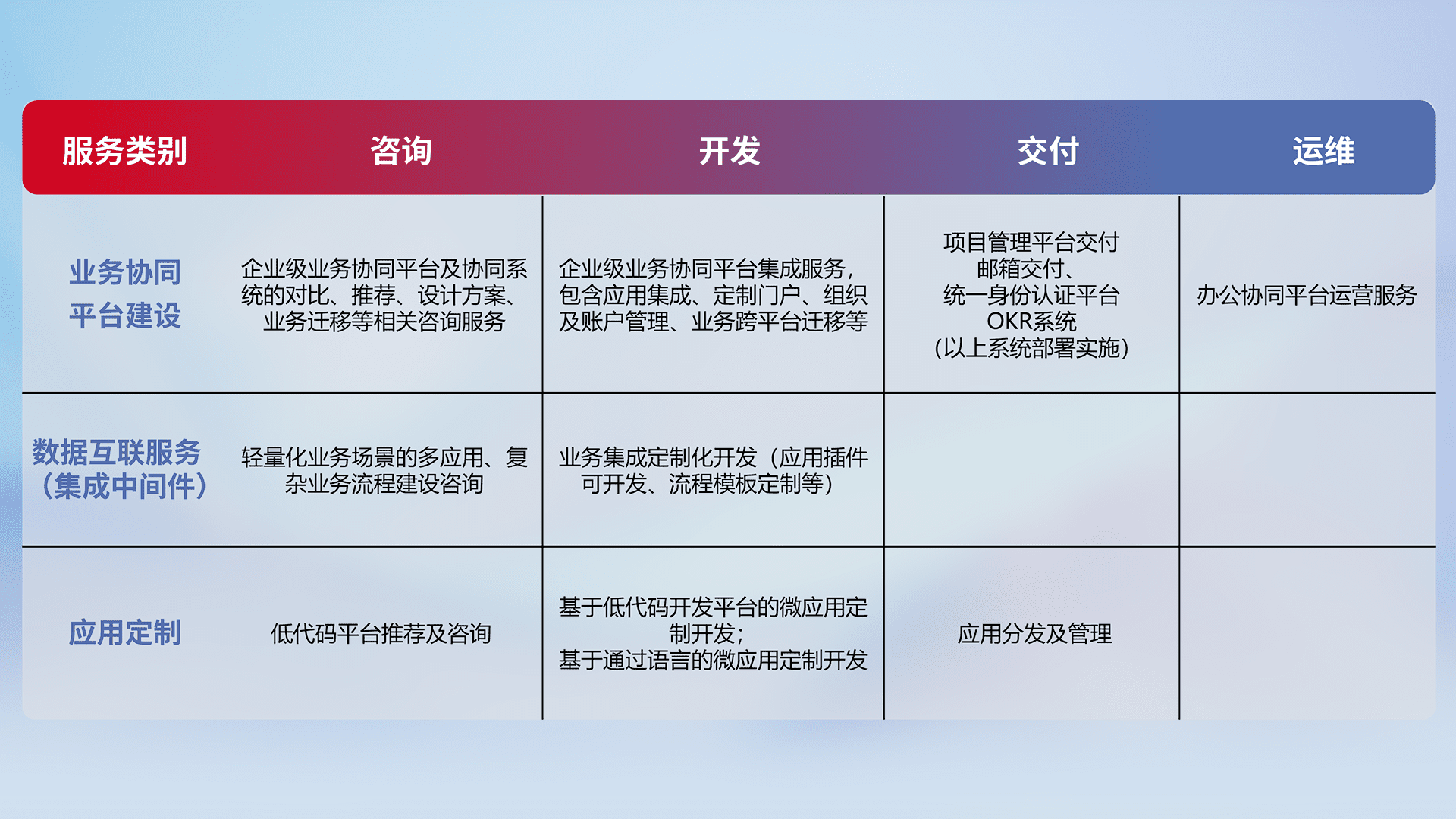 针对钉钉、、、企微、、IDaas等平台级产品提供产品的规划、、、方案、、、交付、、、、定制化开发等服务,,实现如统一协同办公、、、、智能客户服务、、、、混合会议管理、、、、智能数据查询、、等业务场景,,,实现数字化转型。。。。
